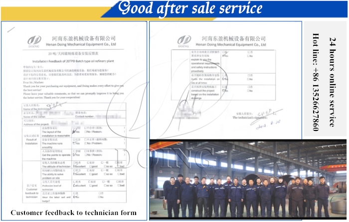 Because palm oil mill plants need professional engineer to guide installation & debugging machine to make machine run well. In order to ensure the rights and interests of customers, every time we will give one “customer feedback to technician form " to customer. After our engineer team finish installation and debugging, we will get feedback from customer about technical service, if they are not satisfied with service, we will let engineer solve these problems until the customer is satisfied. Meanwhile, we will provide prolong technical service. During your operation, any questions, you can contact us at any time within 24hours.